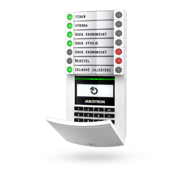 Πληκτρολόγιο bus λευκού χρώματος που διαθέτει οθόνη υγρών κρυστάλλων LCD με ενσωματωμένη μονάδα πρόσβασης RF-ID για τα συστήματα της σειράς ασφαλείας - συναγερμού και αυτοματισμού Jablotron 100+ που επιτρέπει την πρόσβαση με κάρτες RF-ID στα σημεία που υπάρχουν θέσεις για πληκτρολόγια. Ενσωματώνει 4 λειτουργικά πλήκτρα ελέγχου τoμέων, εξόδων και άλλων λειτουργιών με οπτική ένδειξη κατάστασης. Το πληκτρολόγιο είναι συμβατο με τα συστήμτατα JA-102K, JA-103K και JA-107K.