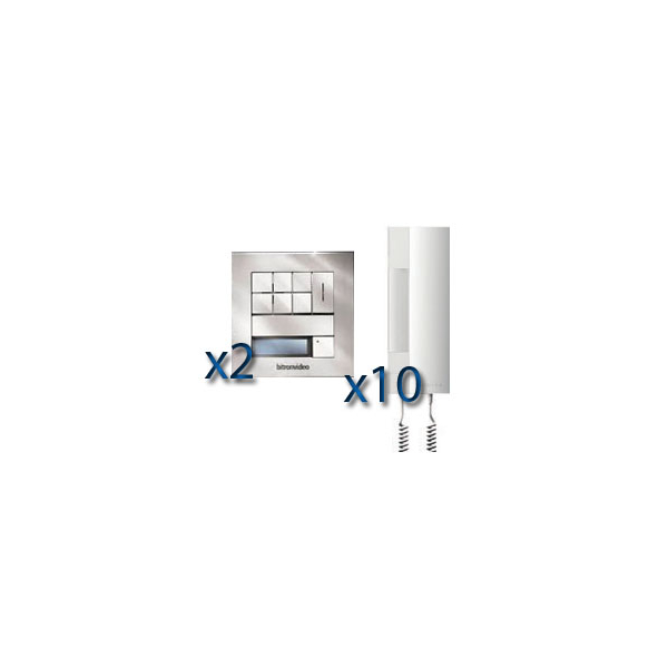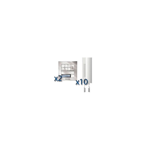 Κιτ θυροτηλεφώνου πολυκατοικίας για 10 διαμερίσματα με 2 εισόδους. Το πακέτο περιλαμβάνει μπουτονιέρα Domular Classic, καθώς και 5 θυροτηλέφωνα.